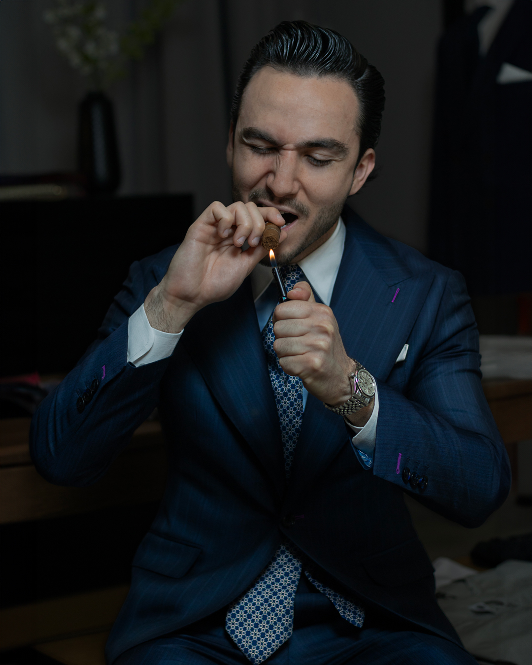 Nos dedicamos a la sastrería personalizada basándonos en el estilo de cada cliente. Desde los ojales en contraste morado hasta la solapa de punta de lanza de 4.5 pulgadas, cada detalle ha sido cuidadosamente seleccionado para reflejar la sofisticación y el estilo distintivo de nuestro cliente. Cada traje es una obra de arte única, diseñada para realzar la personalidad de quien lo lleva.